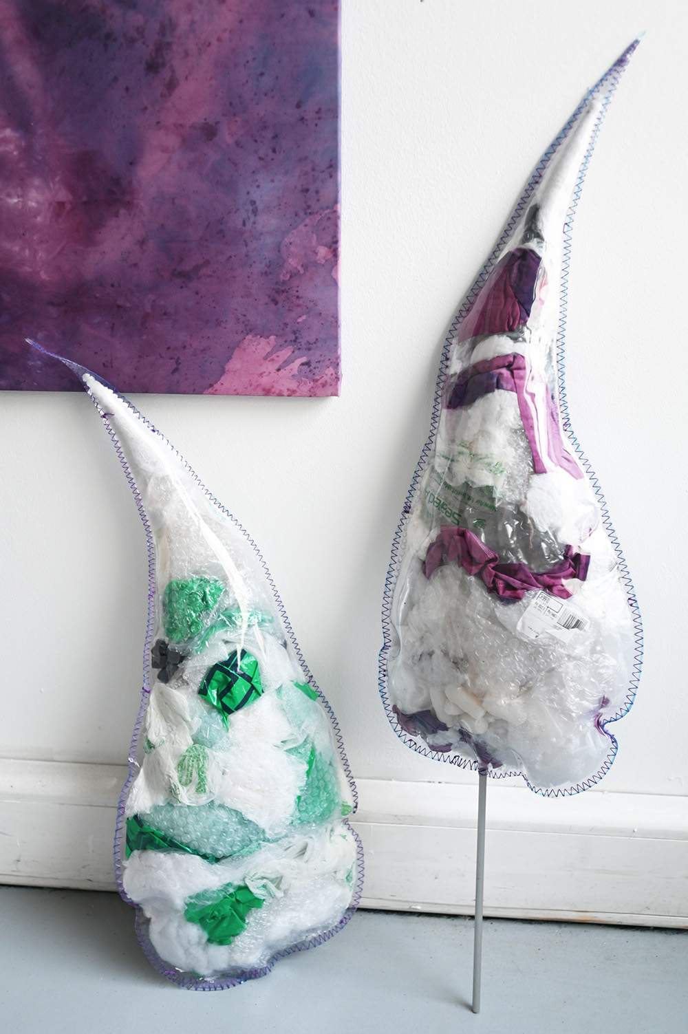 Les sculptures de Botanique Plastique reprennent les descriptions de ce livre, pour reproduire ces plantes fantastiques, en y ajoutant une structure en PVC souple permettant d’entrevoir leur anatomie interne faite de matériaux de récupérations, principalement des déchets plastiques.