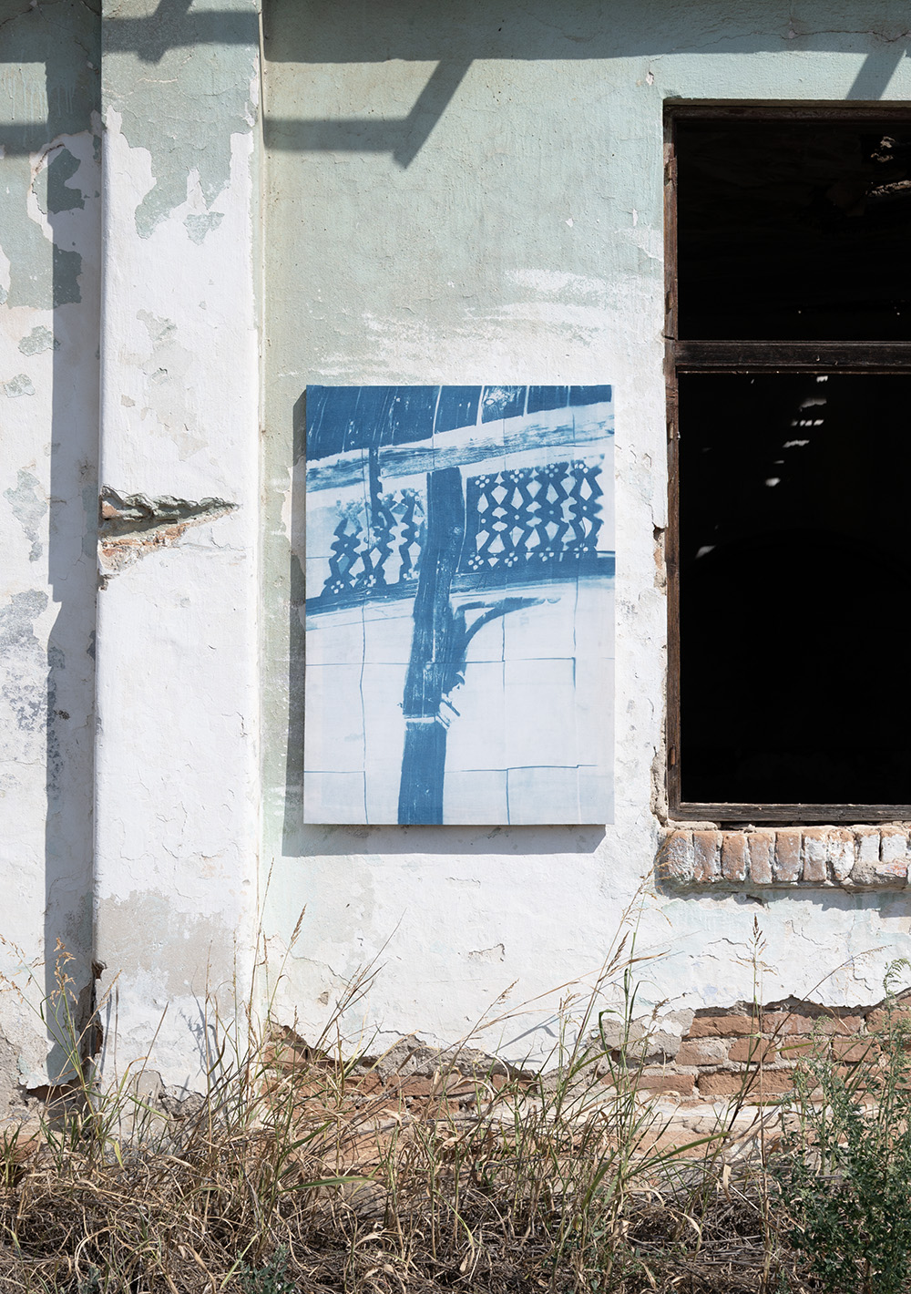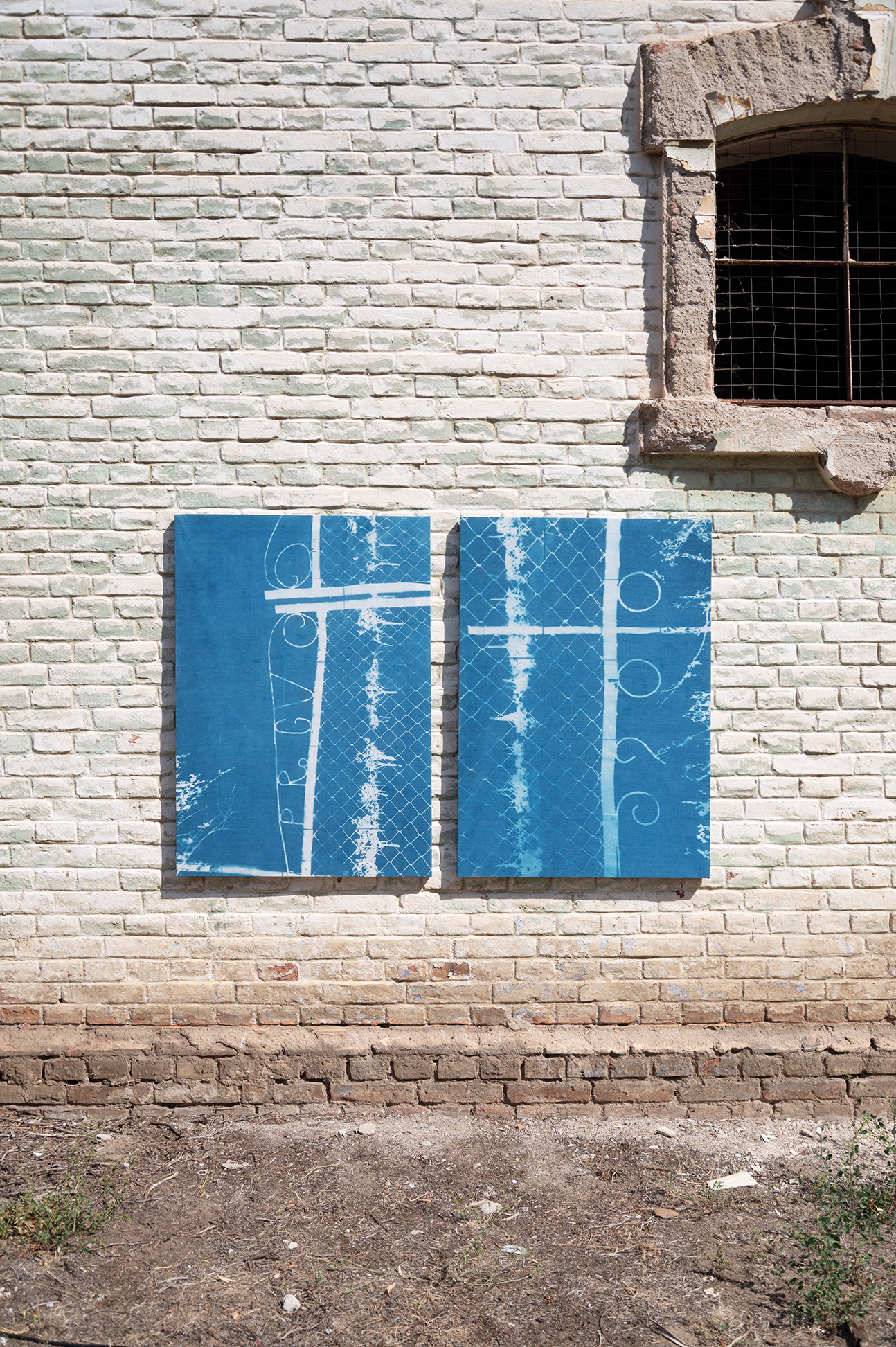 Shadow/Gate, 2025, cyanotype sur tissu, (2x) 85x120cm