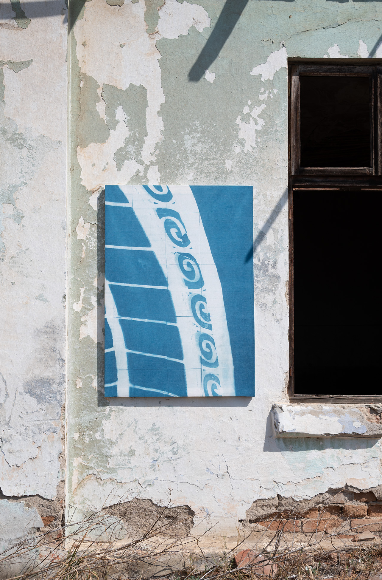 Pour rendre perceptibles ces porosités de l’architecture et de la nature, Emma Durovray s’empare de la dimension cyclique qui régit la vie des plantes et celle des ombres portées des ornements. Envisagées comme les témoins silencieux des activités humaines, des plantes tinctoriales sont prélevées sur le lieu, et traitées pour colorer des tissus préalablement préparés dans une solution à base d’alun.